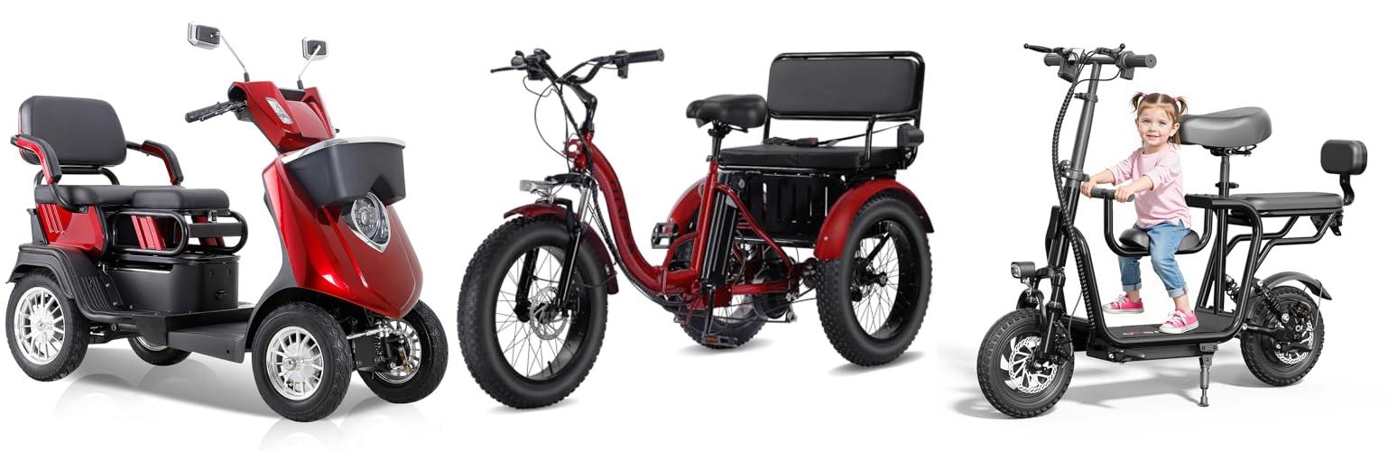 • The electric scooter with seat can carry two adults and one child, or the child’s seat can be removed for carrying pets or cargo.