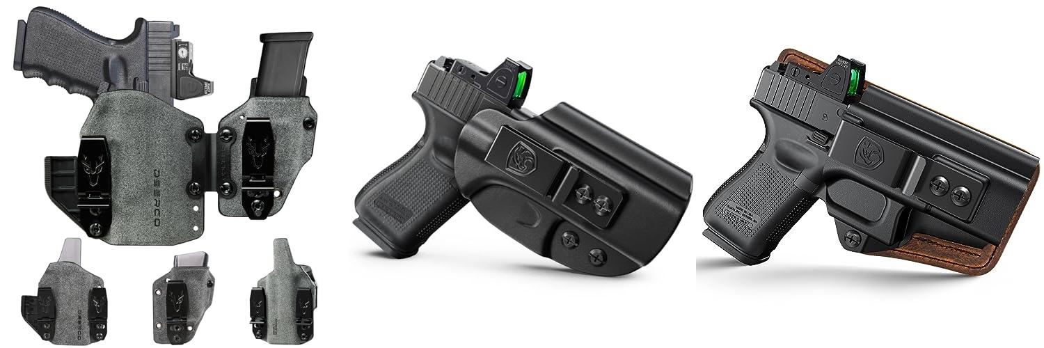 The Deerco Appendix Carry Holster is designed for comfort and versatility. It fits many Glock models and the P10C. This holster lets you carry your firearm in different ways, hidden or not. It also protects your gun from scratches.