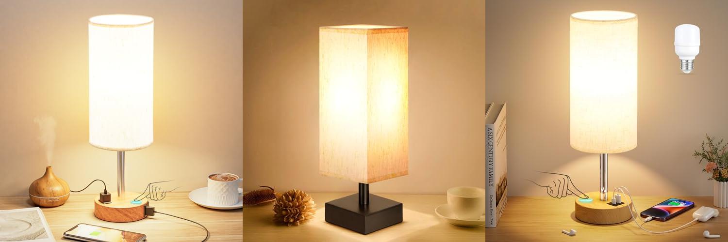 3. Touch Bedside Table Lamp with USB – 3 Way Dimmable Wood Lamp for Bedroom Nightstand