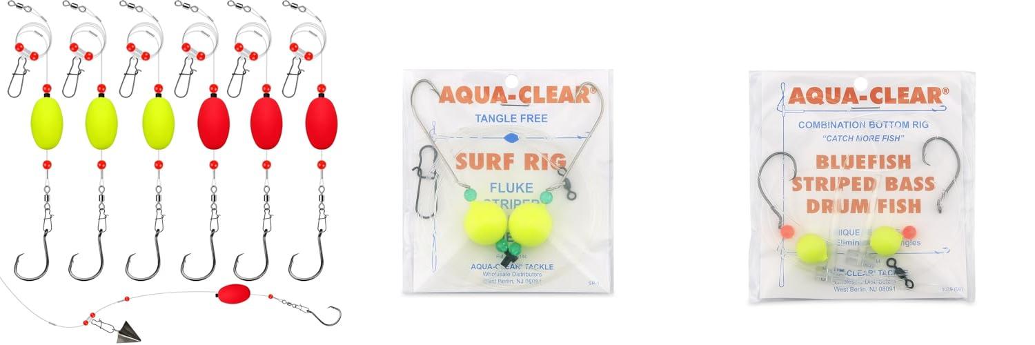 Get ready to reel in some big catches with the Aqua-Clear Surf Ball Hi-Lo Rig! This rig is designed for a variety of popular saltwater fish like flounder, fluke, striped bass, weakfish, and bluefish. It comes with a size 1 XL hook, a strong AFW swivel, and tough 60 lb / 27.2 kg Grand Slam Mono fishing line. Plus, it has chartreuse floats and beads to help attract fish to your bait.