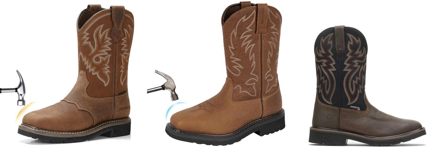 1. HISEA NINGO Men’s Western Cowboy Boots Square Toe Steel/Soft Toe Work Boots Men’s Safety Toe Leather Work Boots