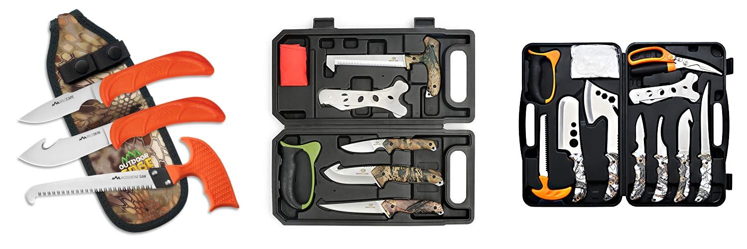 - The set includes a 7-1/4″ caping knife, an 8-3/4″ gut-hook knife, and a 12″ boning knife.