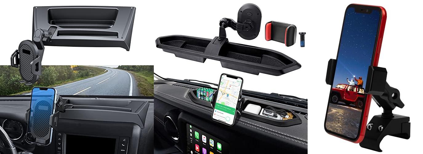 The DIAMOOKY Upgraded Phone Mount is designed for Jeep Wrangler JK and JKU models from 2011 to 2018. This phone mount comes with a storage tray. It helps you keep your phone secure while you drive. The mount also allows you to position your phone at the best angle. This can make your drive safer and more enjoyable.