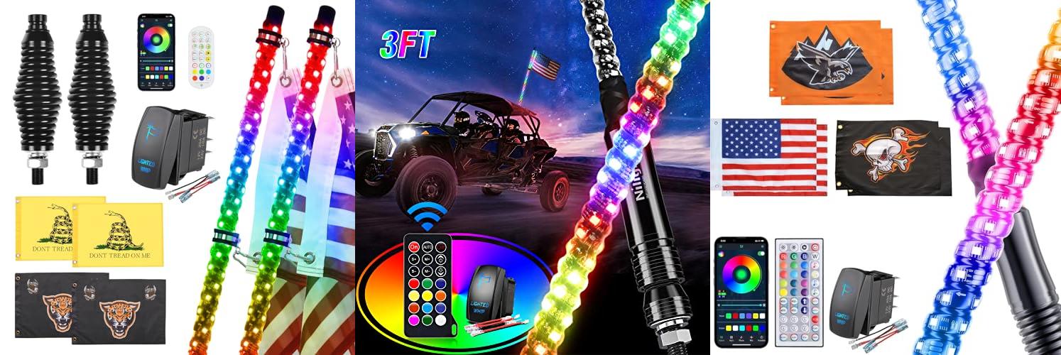 - Spiral RGBW Chasing 4ft Whip Lights: These whips offer hundreds of colors and cool dancing patterns. The 360° glow makes sure you’re seen from every angle, increasing your safety at night.