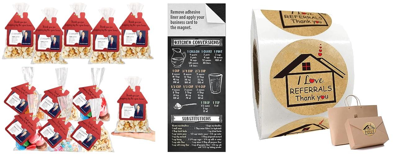 A: Small, inexpensive items like branded pens, magnets, or small notepads are good for open houses.