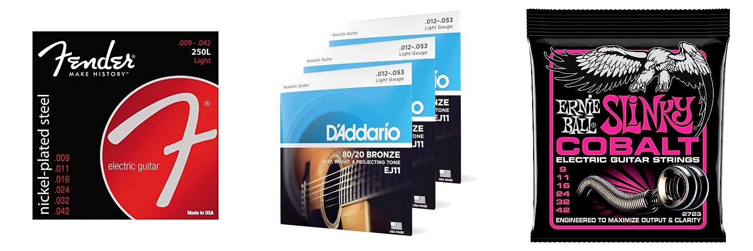 A: Many brands make great strings. Try Ernie Ball, D’Addario, or Fender. These brands are great!