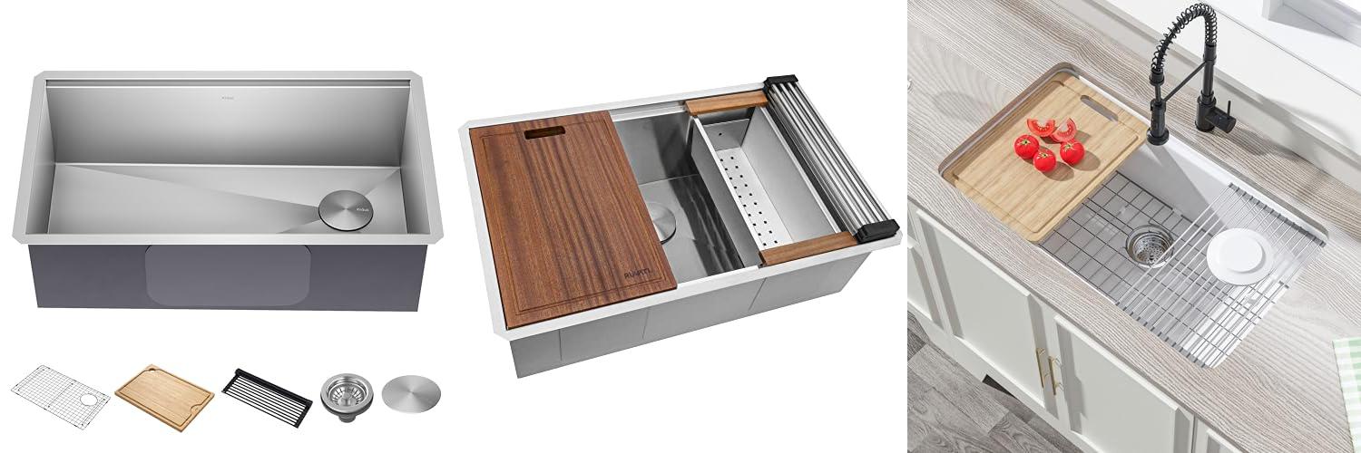 The Ruvati 32-inch Workstation Undermount Kitchen Sink is a stylish and functional addition to any kitchen. This stainless steel sink is built tough and designed to make your life easier. It comes with cool accessories and features that make it a great workstation. The brushed finish hides scratches, and the soundproofing keeps things quiet.